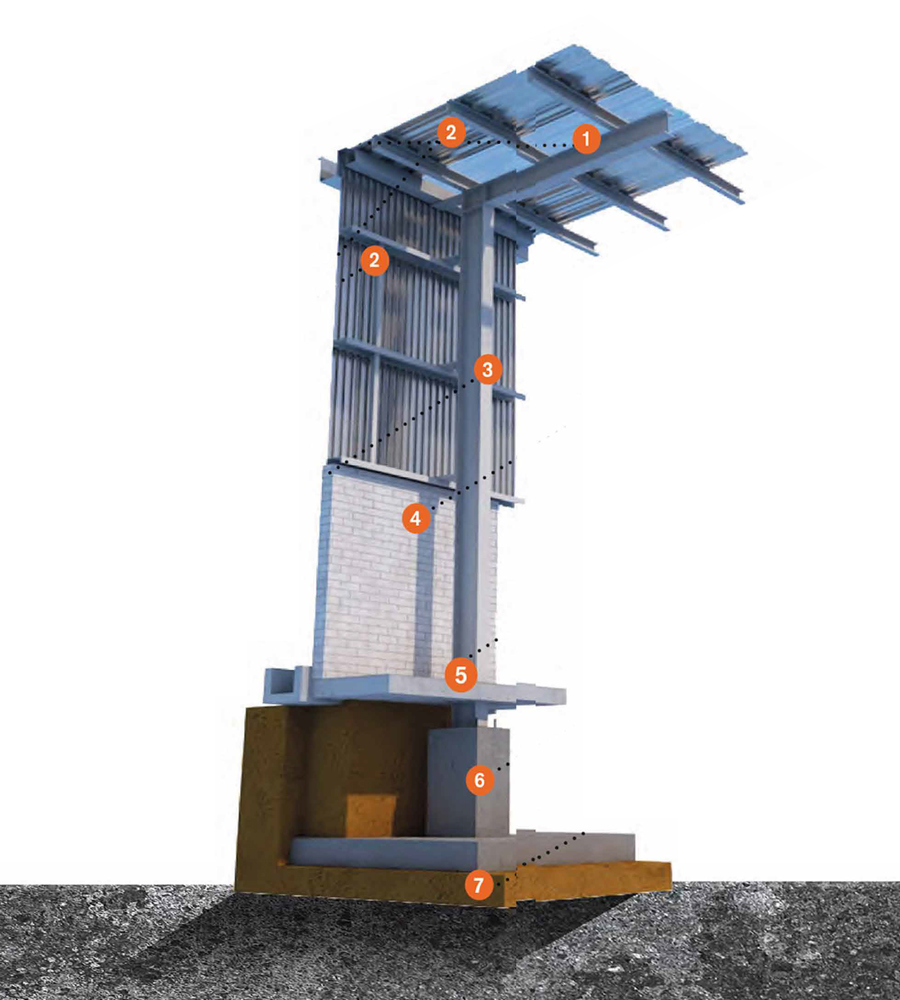 Formada por marcos rígidos de rápida instalación que le brindan mayor ligereza y resistencia al edificio.